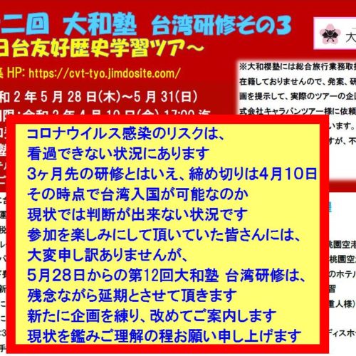 第12回大和塾 台湾研修その3 延期のお知らせ